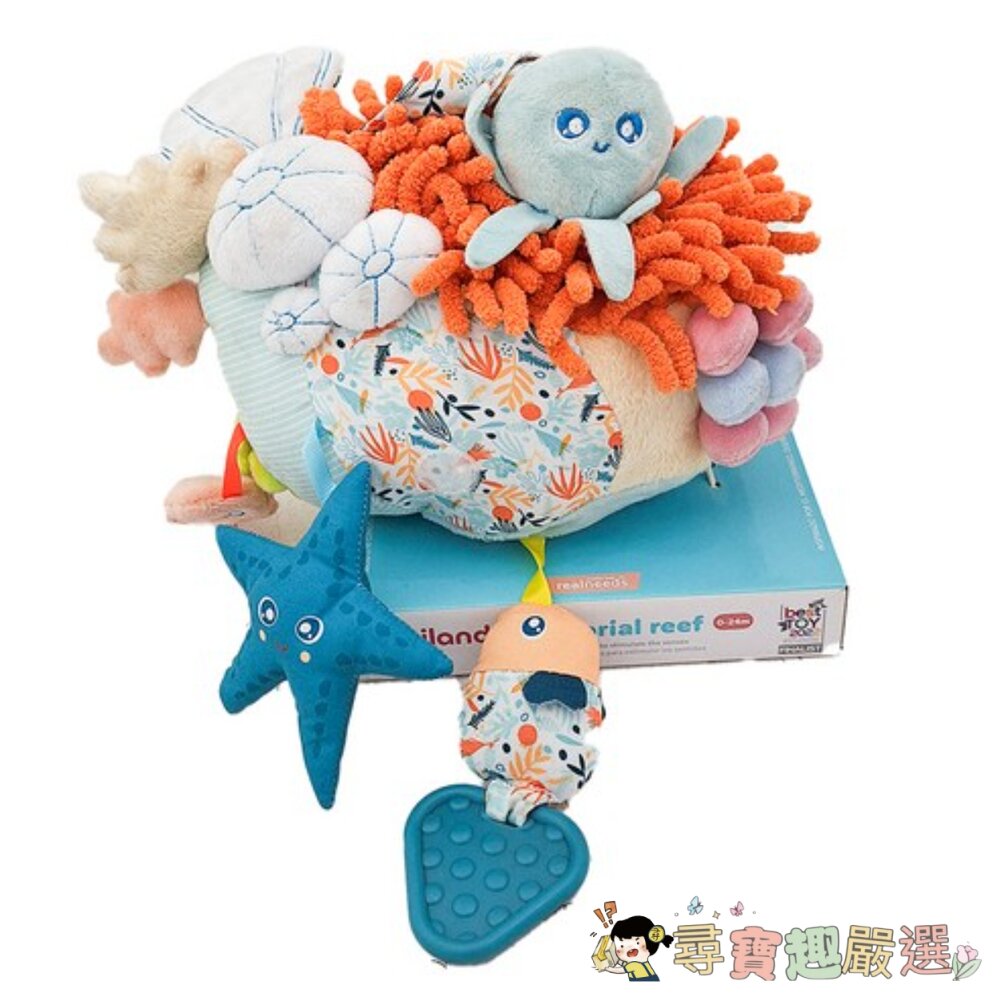 視覺:高對比的色彩設計與豐富的海洋圖案(珊瑚、海星等),吸引目光並促進視覺發育。