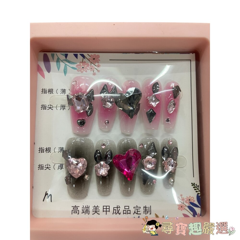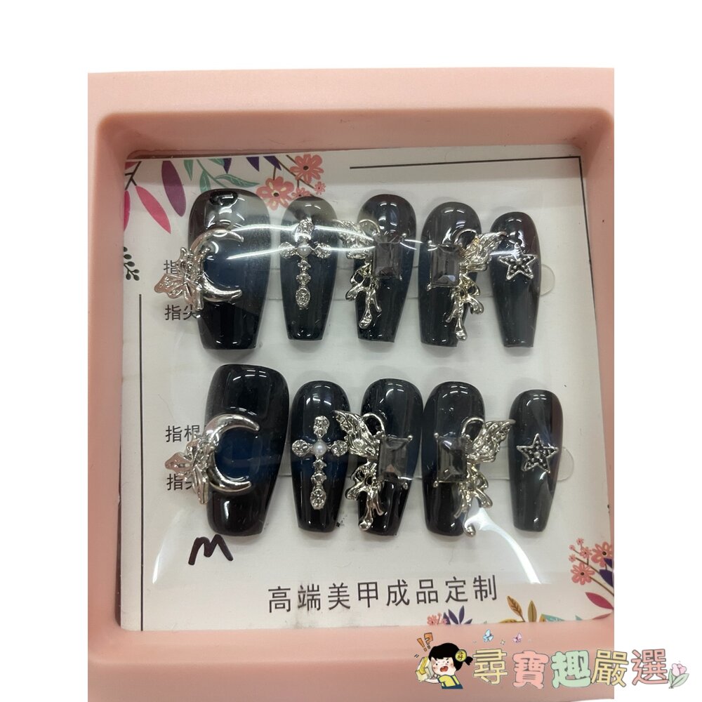 造型甲片+膠+收納盒 穿戴甲 黑底帶立體飾品